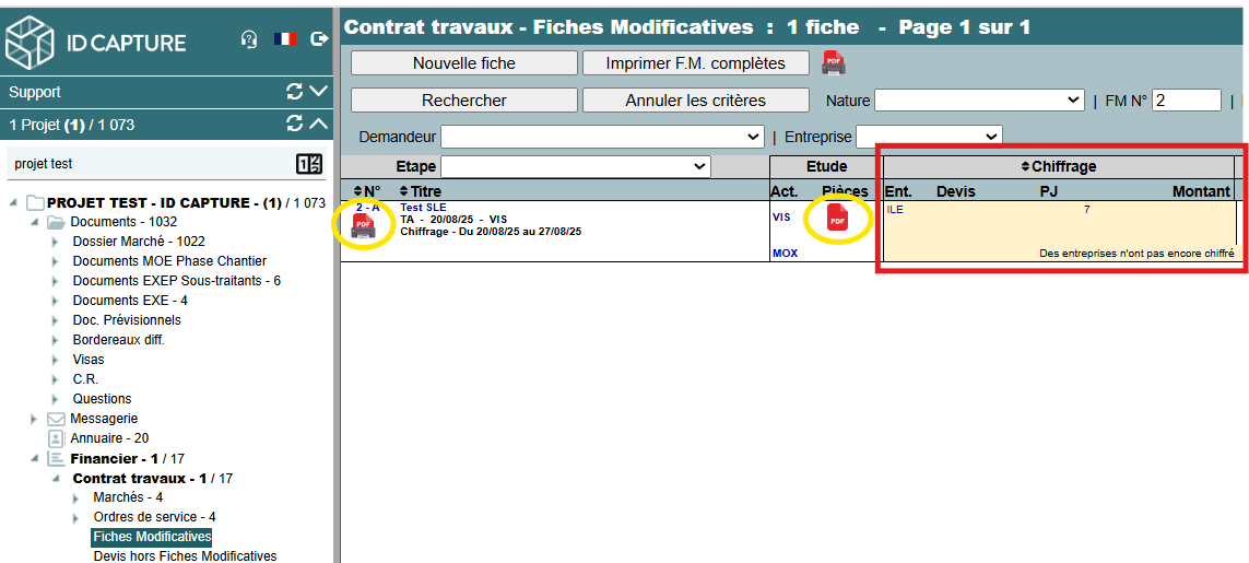 Dès la phase Chiffrage lancée, vous pouvez télécharger le descriptif de la fiche ainsi que les pièces études (entourés en jaune) directement depuis la liste des FTM :