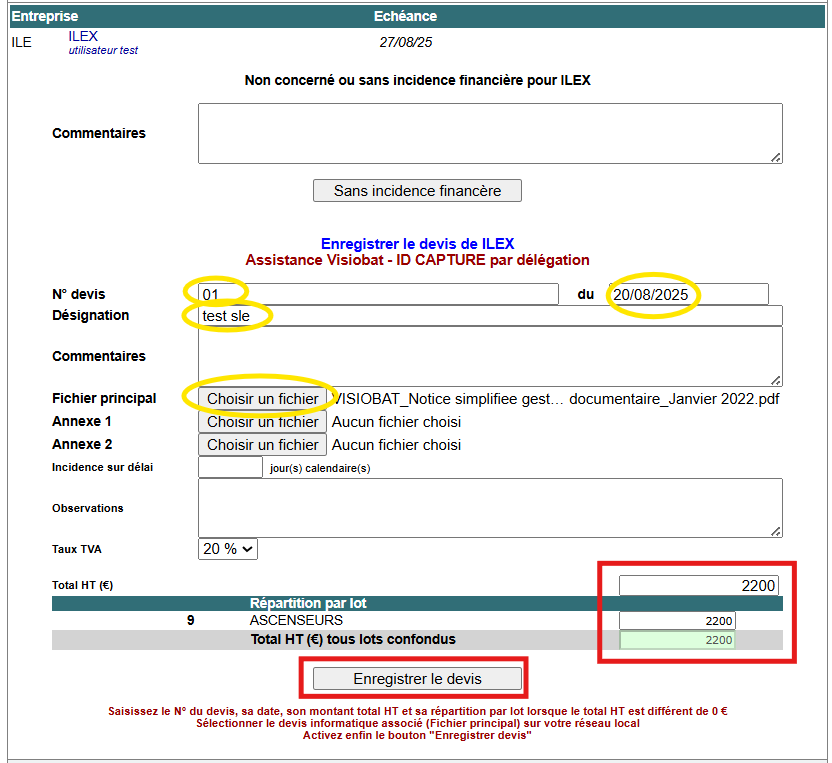 Pour déposer votre devis, vous devez renseigner les informations de la fenêtre de dépôt :