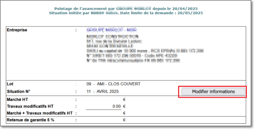 Pour la modifier et rendre la main à l’entreprise sur sa saisie d’avancement et sa demande d’acompte, suivez les étapes 1 à 3 ci-dessous.