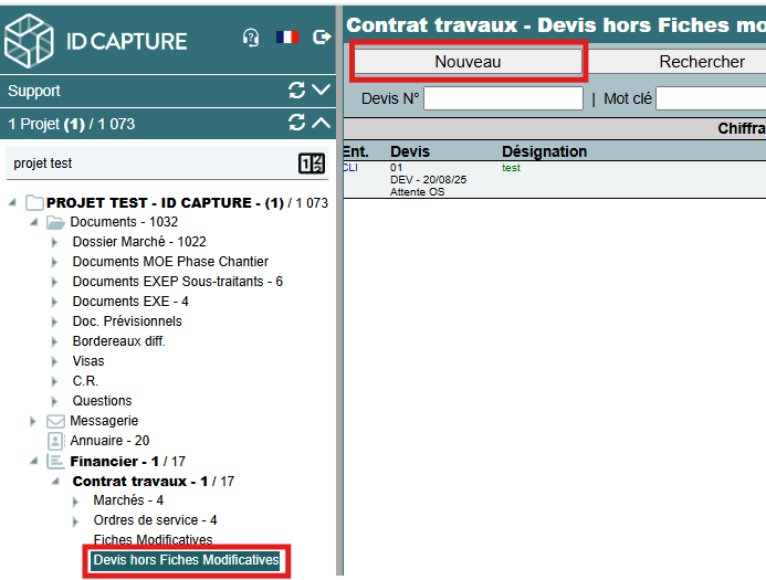 Dans le volet Financier de l'arborescence, dépliez la branche du marché de travaux concerné et cliquez Devis hors fiches modificatives, puis Nouveau dans la partie droite de la page :