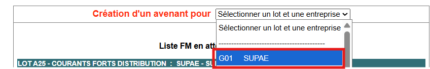 2) Cliquer sur Nouvel Avenant et sélectionner le lot et l'entreprise pour charger la page entièrement :